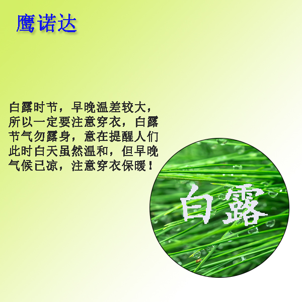 白露时节已经过去一天了,从此之后早晚温差较大,鹰诺达建议大家注意穿衣保暖。俗语有言“白露节气勿露身”意在提醒人们此时白天虽然温和,但早晚气候已凉,如果打赤膊就容易着凉。所以白露时节...【详情】 -