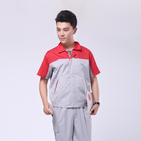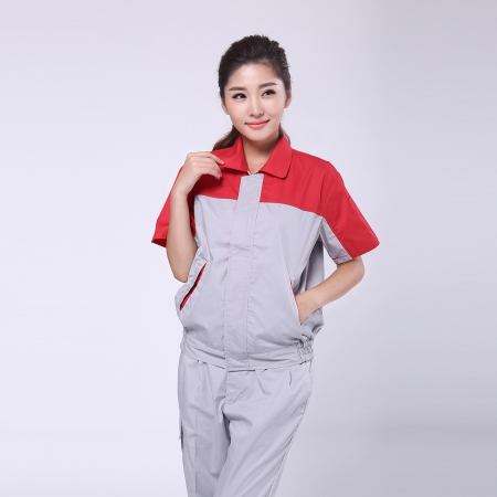 苏州鹰诺服装:大红配浅灰全棉厂服工衣定做AC078-QM
