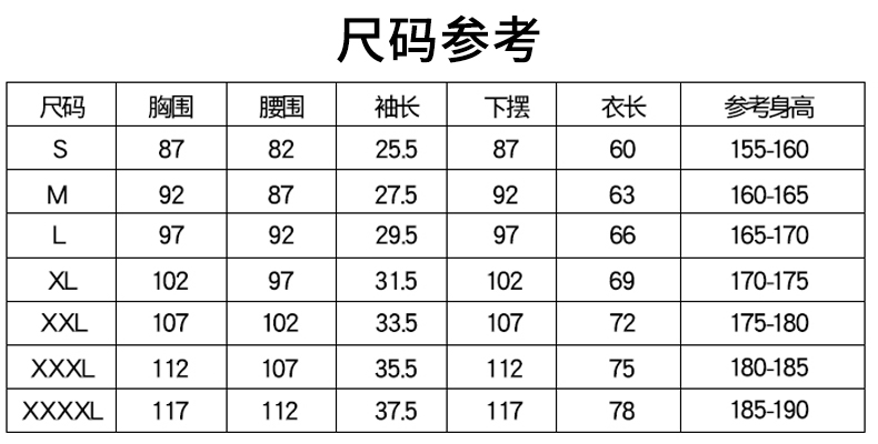 本产品共8个尺码:XS、S、M、L、XL、2XL、3XL、4XL 覆盖99.5%的人群。查看尺码表>