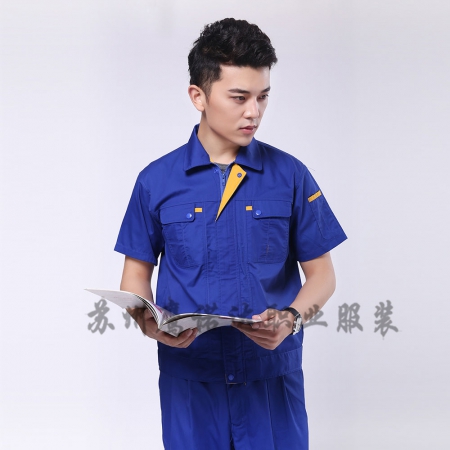 苏州鹰诺服装:深蓝配桔红短袖工作服AD069