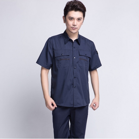 苏州鹰诺服装:深蓝配桔红短袖工作服AD069