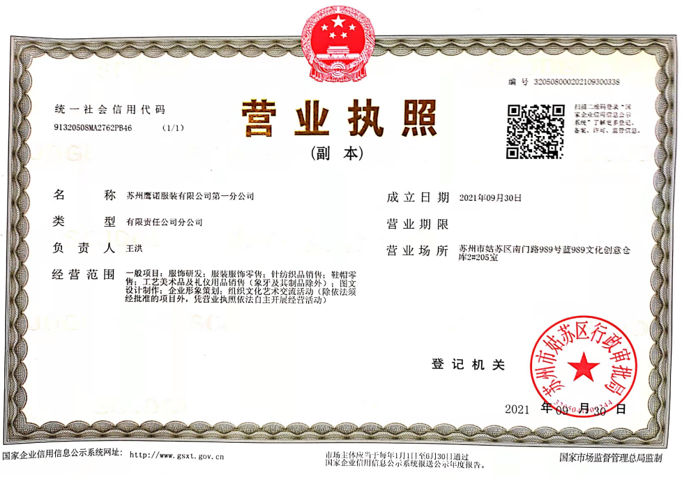 苏州鹰诺服装:苏州鹰诺服装有限公司第一分公司资质