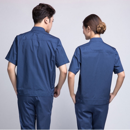 苏州鹰诺服装:深蓝配桔红短袖工作服AD069
